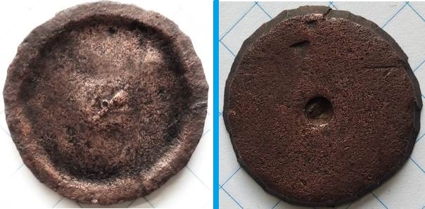 Koperen schijf met een opstaande rand. In het midden een klein puntje en een lichte niet herkenbare afdruk.