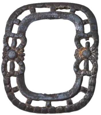 Tweedelige gesp (waarbij het middenstuk ontbreek). Een sierlijke rechthoekige vorm met over elkaar lopende bloemranken met in het midden van iedere zijde een bloemetje.
