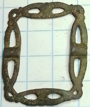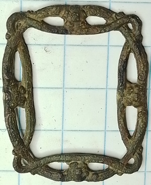 Tweedelige gesp (waarbij het middenstuk ontbreek). Een sierlijke rechthoekige vorm met over elkaar lopende bloemranken met in het midden van iedere zijde een bloemetje.