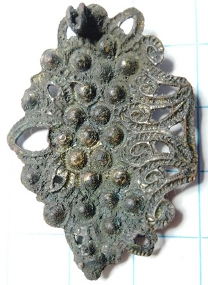 Op de achterkant is nog wat goud vergulding te zien en het bevestigingspunt van de speld. Stansen is men gaan doen vanaf einde 18de eeuw tot nu. Deze stijl van gekleurd glas komt een groot deel van de 20ste eeuw voor.