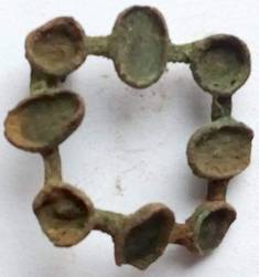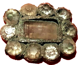 Vierkant sieraad, broche of hanger, waar oorspronkelijk 8 steentjes of stukjes glas in hebben gezet. Op de hoeken ronde steentjes in het midden ovalen. Datering voor 1940