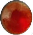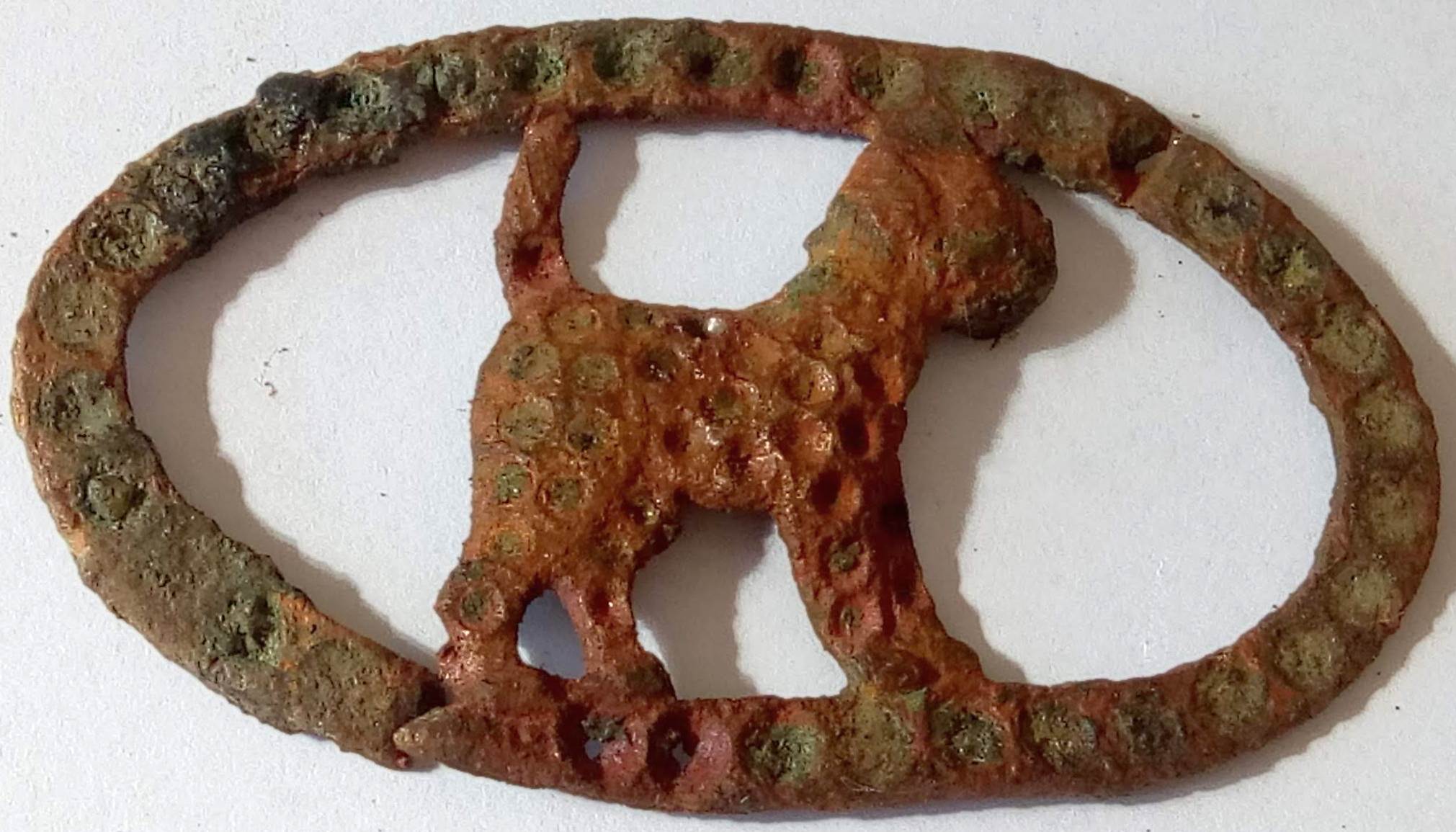 Ovaalvormig sieraard (broche) met hierin een afbeelding van een kat. Hetgeen is versierd geweest met een groot aantal rood gekleurde facet geslepen stukjes glas. Hiervan is er 1 bewaard gebleven. Hieronder een mogelijke reconstructie.
