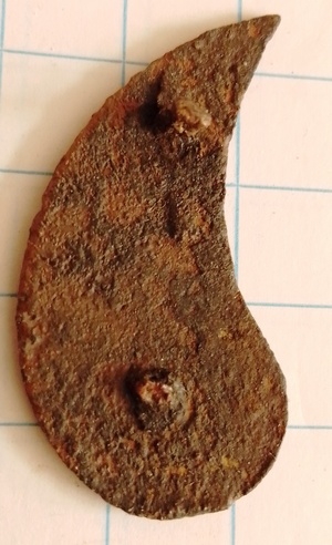 Glad beslag kommavormig met twee afgebroken pennen achterop