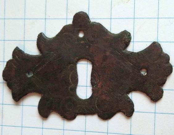 Gegraveerd stuk kastbeslag, een slotplaat, met bloemetjes en streepjes. Datering 16de/17de eeuw.