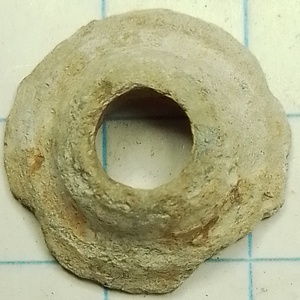 Conisch, metalen object van enkele centimeters groot, met centrale doorboring, (2) gebruikt om een stokje te centreren en te laten draaien en zo draad te spinnen;