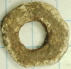 Dit loden schijfje heeft veel overeenkomsten met de schijfvormige loden spinklossen uit de middeleeuwen. Voorlopige datering (PAN) 800-1400