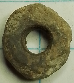 Conisch, metalen object van enkele centimeters groot, met centrale doorboring, (2) gebruikt om een stokje te centreren en te laten draaien en zo draad te spinnen;