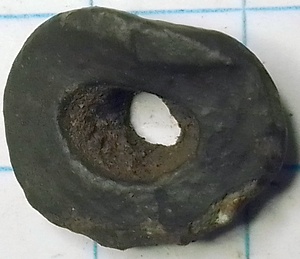 Conisch, metalen object van enkele centimeters groot, met centrale doorboring, (2) gebruikt om een stokje te centreren en te laten draaien en zo draad te spinnen;