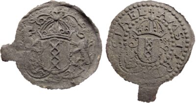 Staallood van Amsterdam uit 1584. Afmeting ca 40 mm