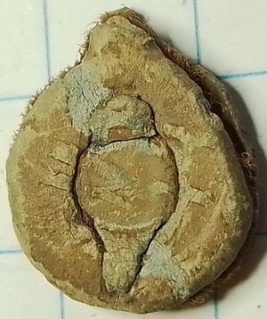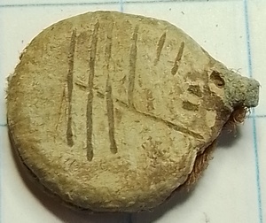 Dit is een deelbewerkers lood van een laken met een telmerk waarmee de lengte werd aangegeven in ellen. Datering 1600-1700