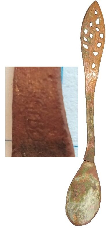 Versierd theelepeltje met op de achterzijde een merkstempel. Letters “TB” zijn niet goed leesbaar en staan in een horizontale ovaal.
