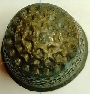 Een vingerhoed met handmatig geproduceerde putjes (1300-1725). Dat is ook te zien aan het zonnetje dat aan de bovenkant is ontstaan doordat de putjes niet uitkwamen. Door de vorm is deze aan het einde van deze “handmatige” periode te plaatsen.