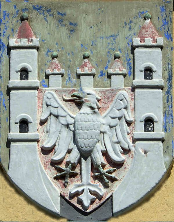 Wapen Hanzestad Neurrupin. Kasteel of burcht met vier torens, twee grote toren en drie kleintjes. Op het gebouw zelf staat een naar links kijkende adelaar op een schild.