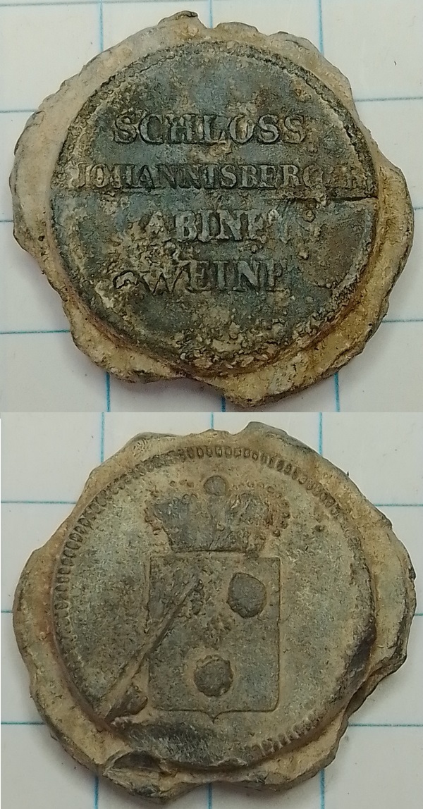 Bij navraag bij het nog steeds bestaande wijnhuis Schloss Johannisberg krijg ik de volgende informatie: “De zegels zijn van het wapen van de prinsen van Metternich-Winneburg en de achterkant zijn de wijnen uit de kabinetkelder. Ik weet niet hoe oud het is en waar het voor gebruikt is. Maar ik denk dat het zegel werd gebruikt voor documenten of voor het verzegelen van de kastwijnen van Schloss Johannisberg. Dit waren bijzondere en waardevolle wijnen uit de kasteelkelder.”