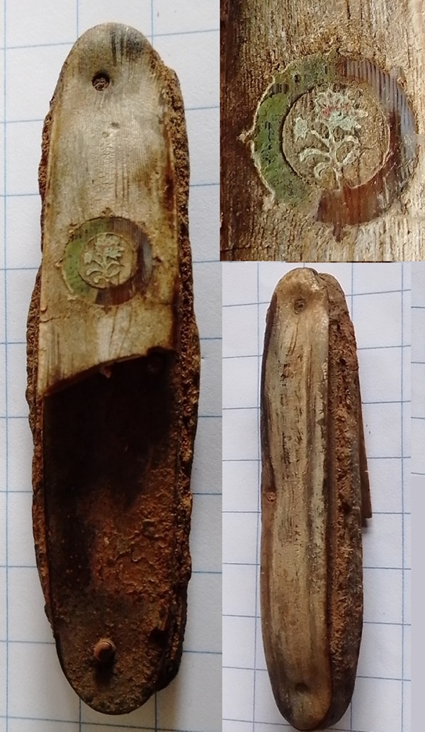 Zakmesje met een heft van waarschijnlijk ivoor. Lemmet en andere functies zijn van ijzer en zijn verroest. Opvallend is dat op dit zakmes een afbeelding staat van waarschijnlijk Edelweiss. Deze bloem werd door Duitse soldaten gedragen als teken van moed. Aan de keerzijde kun je zien dat er letters op hebben gestaan.