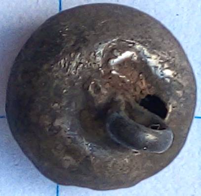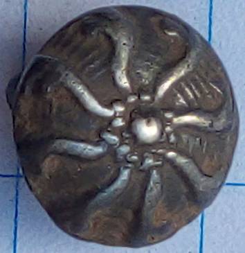 Zilveren knoop met waaier van 8 ribben die eindigen in een klein bloemetje in het midden. Tussen de ribben zitten ook weer verticale lijnen. Datering 18de eeuw.